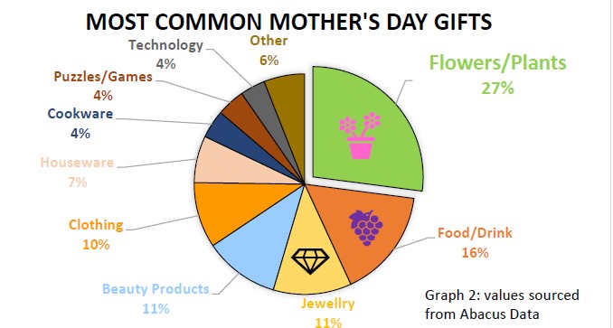 It goes without saying that children don’t always listen to their mothers. Hence, a gift is usually part of the celebrations on the special day. Generally, flowers are among the most common gifts on Mother’s Day, (see graph 2). A drive past any florist or garden centre during the second weekend in May confirms its popularity.