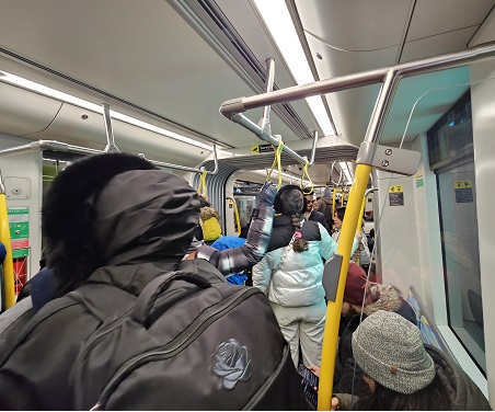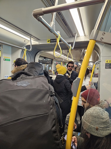 The train is clean (brand new as well), but I can’t really “test” the seats because they’re all taken. Standing up, I notice that the driver still seems to be getting used to the brakes—probably still a bit too new. At every station the train stops with a jolt, and a few people nearly lose their balance. Still, I arrive safely at Eglinton Station (at Yonge) at 5:38 p.m.: the trip took 15 minutes. By bus it would have taken about 25, not counting the wait at the stop (so, realistically, even longer). And waiting for a bus outside, in –15°C weather, is quite different from waiting for a subway train indoors—not a minor detail at all.