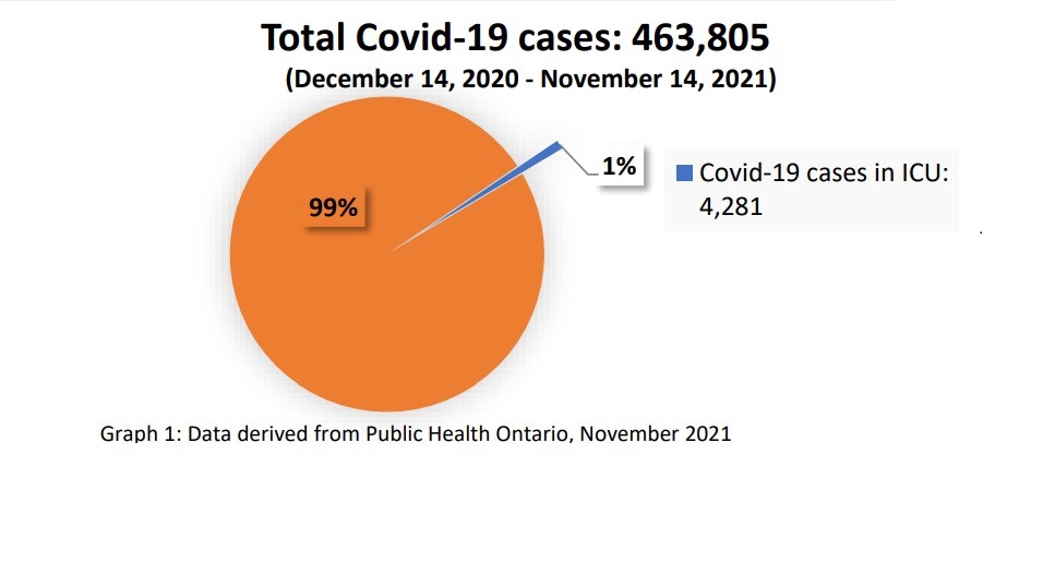 According to a comprehensive report, the Confirmed cases of Covid-19 following vaccination in Ontario, by Public Health Ontario, data collected between December 14, 2020 and November 14, 2021, show that 463,805 people tested positive for Covid-19. In that one-year period, 22,009 people were hospitalized. That represents five percent of all infections in that time frame.