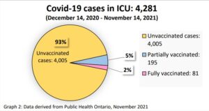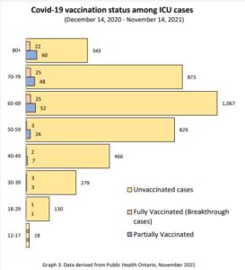 When further broken down by age group, ICU patients aged 80 years and older, the report indicates that 60 were partially vaccinated compared to the 343 who were unvaccinated. That number drops to 22 for those who were fully immunized. (See graph 3)