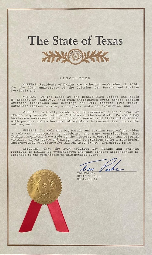 After the presentation by the Master of Ceremonies Jay Lombardo, the National Anthems performed by Gabriella Fresquez and the blessing of the ceremony by Chris Knight, the event moved on to the proclamation of the Grand Marshal Columbus Day Parade in Dallas 2024, Oscar Renda, and the Senate resolution (in the pic below) signed by Tan Parker encouraging participants to be proud of their Italian heritage and complimenting the organisers.