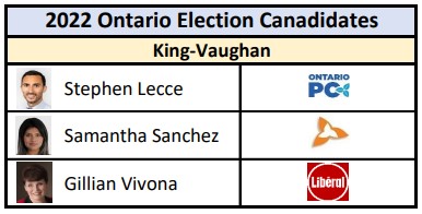 Stephen Lecce, the incumbent, is seeking re-election for the PC and his second term in office. He is the son of Italian immigrants and has represented the riding since 2018 when he won with 56.6% support of the electorate (29,136 votes). The Liberals took 23.3% of the vote, but the PC’s margin of victory was 17,124 votes. That year, the NDP managed only 15.4%.