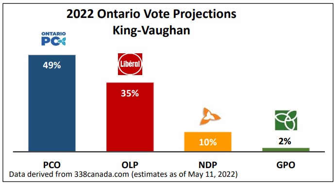 According to the most recent projections by 338Canada.com (May 11), the PC maintain the lead at 49%. The prediction model uses algorithms and considers all major polls. It shows the Liberals at 35% are 14-points behind the PC, followed by the NDP at 10%.