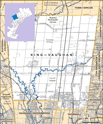 The electoral district of King-Vaughan sits just 40 km north of the City of Toronto. Created in 2015, it is situated in the Regional Municipality of York. The constituency includes the Township of King and the northern part of the City of Vaughan.