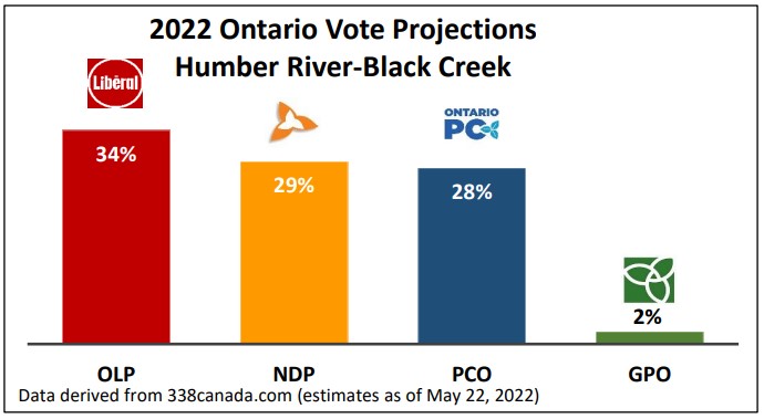 Historically, provincially, the district has been represented by NDP or Liberal MPPs. However, in 2018, when it was contested for the first time as Humber River-Black Creek, NDP candidate Tom Rakocevic won the seat from the Liberals with 37.4% support of the electorate (11,573 votes).