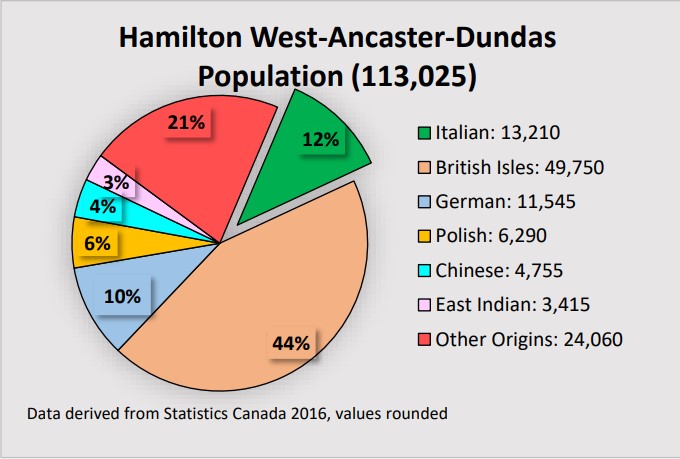 As of 2016, the riding had a population of 113,025. The area is a popular place to call home for many ethnic groups. Italians, at 12% of the district population, are one of the largest cultural groups which originate from Europe. That represents 13,210 residents of Italian origin who live in the constituency, according to the 2016 Census (most recent data available). They have a culture of voting.