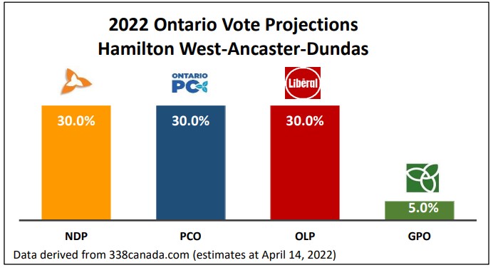 With less than two weeks before the official start of the campaign, it would appear candidates may have their work cut out for them. According to 338Canada.com, the statistical model which uses algorithms that considers all major polls, projections suggests the riding may be up for grabs. The most recent polls (April 14), show all three major political parties, the NDP, the PC and the OLP tied at 30%.