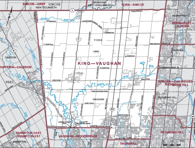 At the north western edge of York Region is the electoral district of King-Vaughan. The constituency was created by the 2012 federal electoral boundaries redistribution and includes parts of the Township of King and the City of Vaughan.