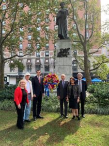 NEW YORK – L’eredità di Dante Alighieri (1265–1321) è stata commemorata il 14 settembre, data della sua morte nel 1321, con due grandi eventi a New York, continuando le celebrazioni del “Dante 700”. Il sole ha brillato intensamente sulla statua di Dante al Lincoln Center di New York City per la ridedicazione della scultura in bronzo, la più grande nelle dimensioni realizzata da Ettore Ximenes, raffigurante il grande poeta e filosofo, autore della Divina Commedia. La scultura è alta più di 25 piedi, una figura imponente che si addice a Dante e al suo monumentale contributo all’umanità.