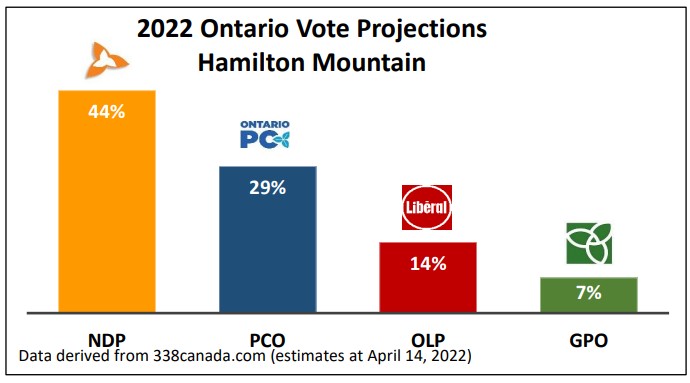 Swaying the minds of voters who have traditionally voted NDP may be a challenge for other party candidates. According to the most recent projections by 338Canada.com (April 13), the NDP are in the lead at 44%. The PC, at 29%, trail by fifteen points, followed by the Liberals at 14%.