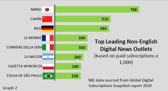 When taking into consideration multinational non-English news providers, Nikkei, the largest Japan-based publication, ranks at the top of the list for the most paid subscribers, nearly 768,000. As for European news websites, the most popular trusted sources of information, based on number of paying customers, are Germany’s Bild (494,000) and Italy’s Corriere Della Sera (300,000). (Graph 2)