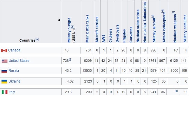To begin, in terms of military spending, Canada has little to offer in materiel for its $40 Billion (USD) annual budgets. It does have 734 battle tanks, if we could get them to the theatre of war. Russia for its $43.2 already has 13,530 such tanks.