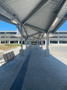 The new Bloomington GO Station is complete with nearly 1,000 parking spots, a three-level parking structure and a passenger drop-off and pick-up area, to help keep commutes as simple as possible. The new bus loop has six bus bays that can accommodate GO Transit services and any future local transit connections. (Photo below, outdoor canopy)