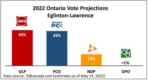 The political landscape in Eglinton-Lawrence is poised for change. According to the most recent projections by 338Canada.com (May 15), the Liberals are in the lead at 40%. The prediction model uses algorithms and considers all major polls. It indicates that the PC, at 39%, trail by 1-point, followed by the NDP at 13%.