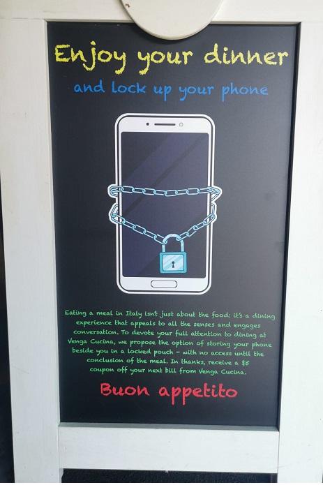To see it, just stop by the place located at 3076 Dundas Street West in Toronto: “Enjoy your dinner and lock up your phone: eating a meal in Italy isn’t just about the food: it’s a dining experience that appeals to all the senses and engages conversation. To devote your full attention to dining at ‘Venga Cucina’, we proposte the option of storing your phone beside you in a locked pouch – with no access until the conclusion of the meal. In thanks, receive a $5 dollars coupon off your next bill from Venga Cucina. Buon appetito!”.