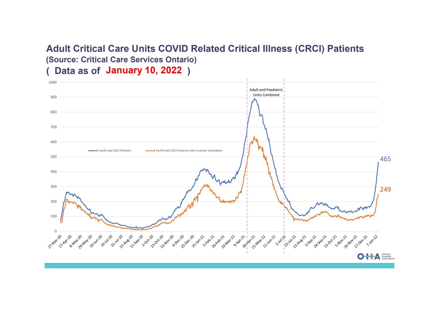 Of the people currently hospitalized with the virus, 465 – the data refers to 10 January – are in intensive care (the day before they were 438, a week ago 266) and, we said, today there was also a record of 80 adults ended up in the ICU, marking a record of day-to-day ICU admissions since the start of the pandemic, according to Critical Care Services Ontario data provided by the Ontario Health Association (OHA).