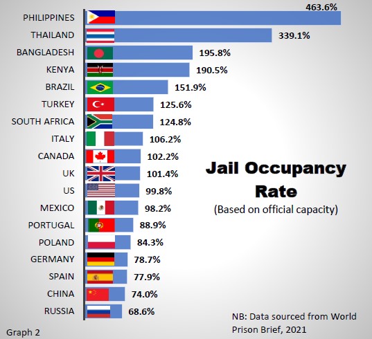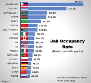 For instance, the Philippines has one of the highest jail occupancy rates in the world – 463.6%. The country’s high occupancy rate is partially explained by President Rodrigo Duterte government’s anti-narcotics campaign. Since he took office in 2016, hundreds of thousands of people have been jailed.