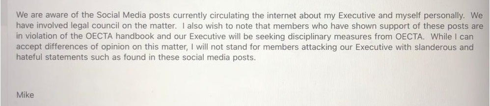 The person seems to suffer from some sort of self-importance disorder. The attached post suggests the OECTA membership is either sheeple in his pen or a brow-beaten class of people uninterested in fulfilling their duty in the face of thuggish behaviour by one of their own.