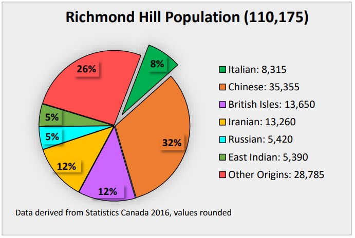 With a population of 110,175 residents, the riding is home to several culturally diverse groups, primarily those of Chinese or Iranian communities. Another significant segment of the local population are those who self-identify as Italian (8,315 residents). They are one of the largest ethnic groups who originate from Europe and represent 8% of the district’s population.