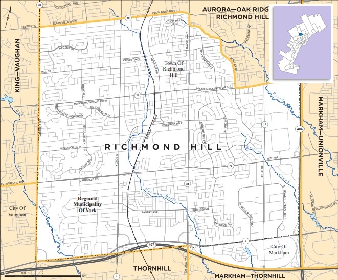 Nestled between Markham in the east and Vaughan to the west, the district was created in 2003 from parts of the Oak Ridges riding. It encompasses the neighbourhoods of Elgin Mills, Langstaff, Bayview Hill, including the southern part of the Town of Richmond Hill and the eastern portion of Markham.