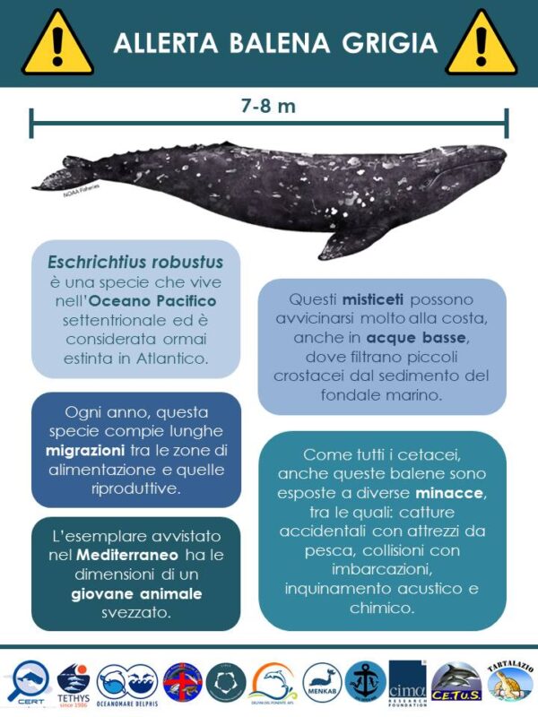 Quello di questi giorni è il primo avvistamento di una balena grigia in acque italiane; l’unico altro nel Mediterraneo risale al maggio del 2010 di fronte alle coste di Israele e, poche settimane dopo, vicino a Barcellona. Un solo animale è stato finora documentato invece in Atlantico: era nel 2013, vicino alle coste della Namibia. Anche per questi casi, sicuramente individui diversi, più grandi di Wally, si era ipotizzato che avessero trovato un passaggio libero dai ghiacci nell’Artico.