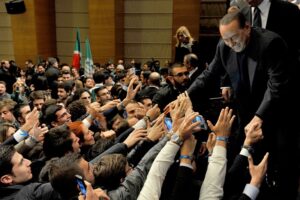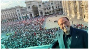In the pic at the top, Silvio Berlusconi in Piazza Duomo in Milan to celebrate a Milan victory, in a photo published by “Il Giornale”; above, the former Italian premier surrounded by fans (photo from Twitter – @forza_italia)