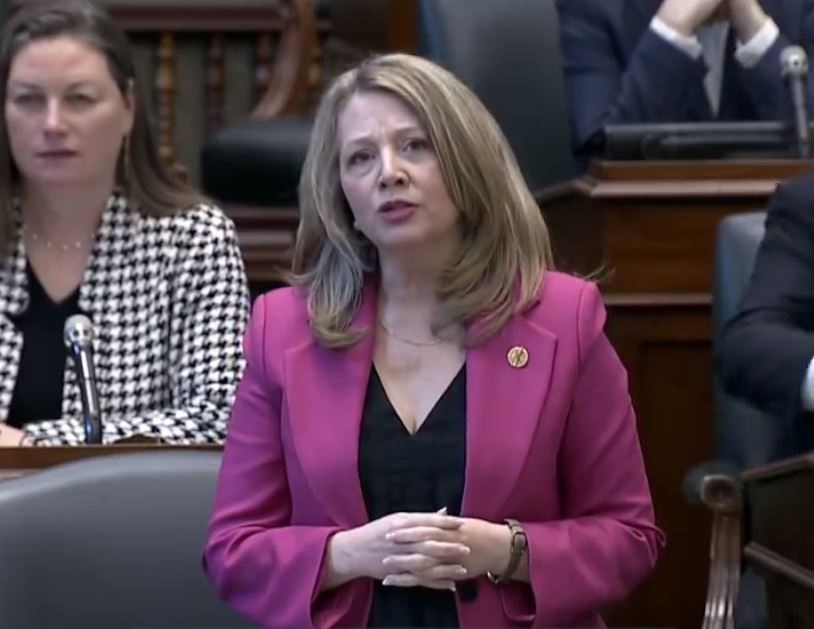 In the pic above: Ontario NDP Leader Marit Stiles in a screenshot from the video of her speech today in Queen’s Park (from Twitter X – @MaritStiles)