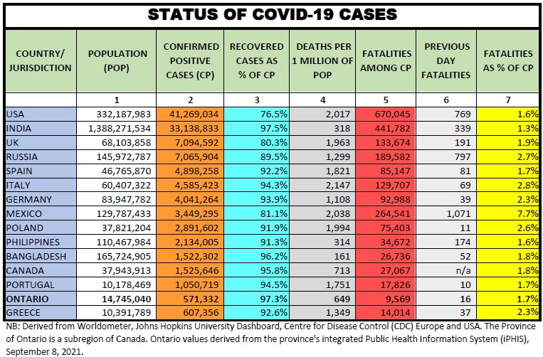 The status of Covid-19 cases in Canada do not reflect complete data for September 8, 2021.