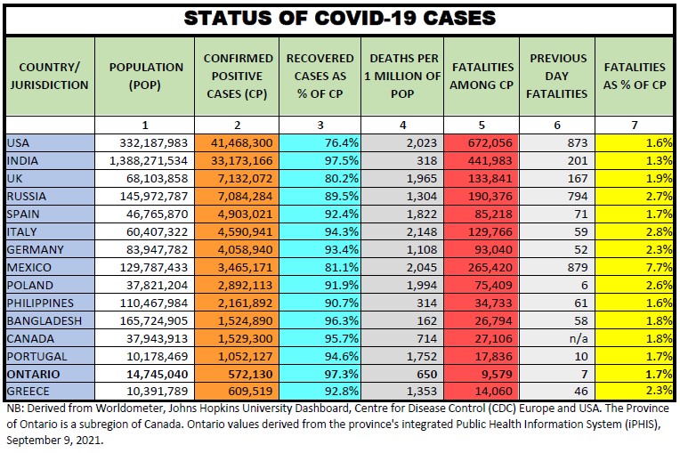 The status of Covid-19 cases in Canada do not reflect complete data for September 9, 2021.