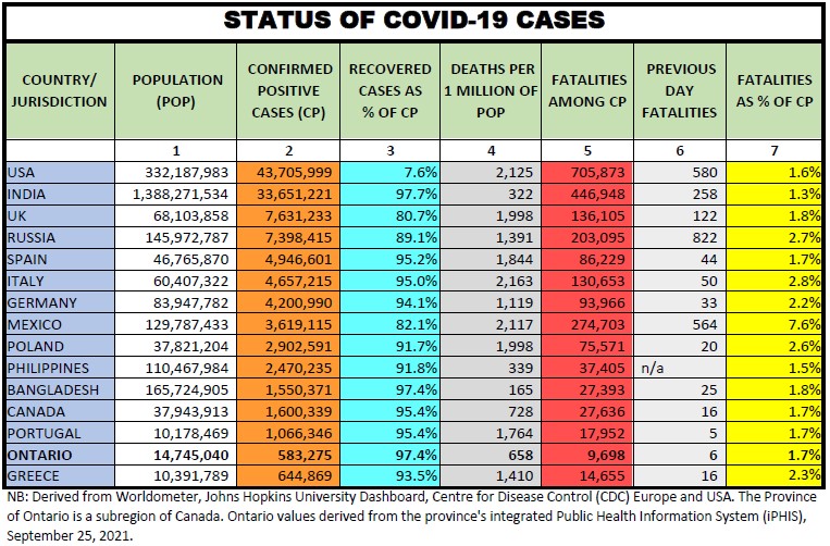 Here we provide a daily update of the data available for select countries and jurisdictions as of September 25, 2021, at 6:20 pm EST.