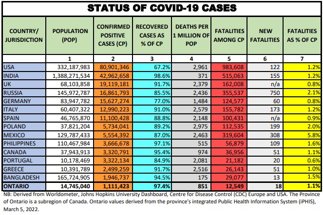 Here we provide a daily update of the data available for select countries and jurisdictions as of March 5, 2022, at 5:00 pm EST.