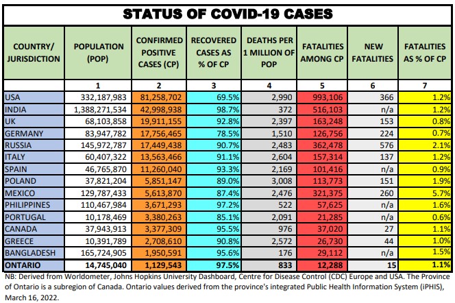 Here we provide a daily update of the data available for select countries and jurisdictions as of March 16, 2022, at 4:30 pm EST.