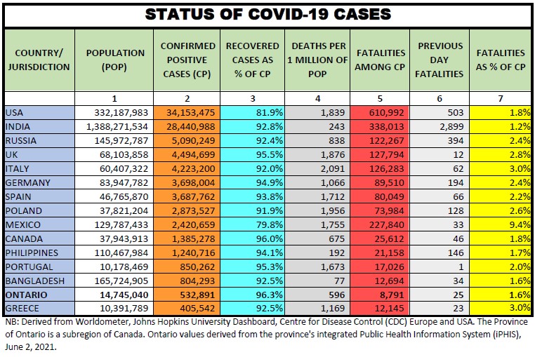 Here we provide a daily update of the data available for select countries and jurisdictions as of June 2, 2021 at 8:45pm EST.