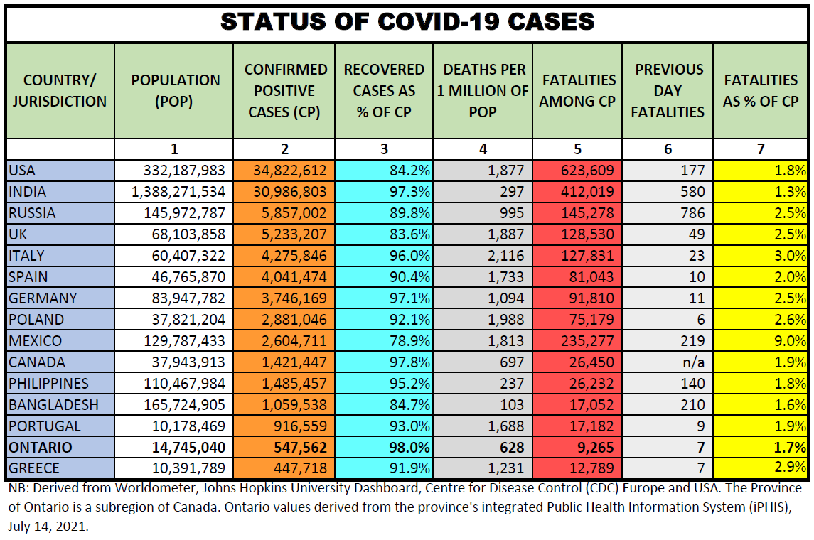 Here we provide a daily update of the data available for select countries and jurisdictions as of July 14, 2021, at 5:00pm EST.
