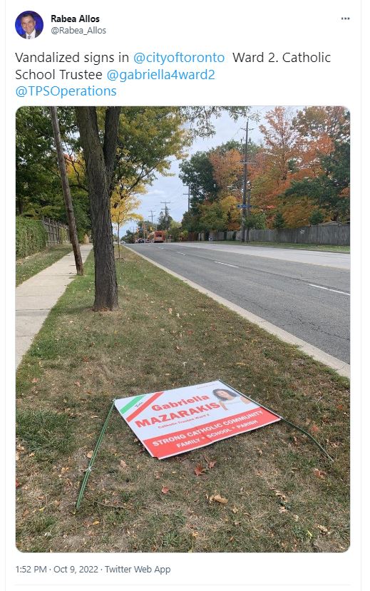TORONTO – Vandals in action against candidates for the position of trustee at TCDSB who intend to defend traditional Catholic values: yesterday someone ripped up the electoral cartels of Gabriella Mazarakis, candidate in Ward 2. “I believe Catholic schools are distinct and exist because families want to pass on to their children the values, culture, tradition and meaning of their faith”, the candidate wrote in one of her tweets during the elections campaign. In another tweet, she posted a quote from Pope John Paul II: Even though the financial viability of Catholic schools has been guaranteed, the task remains of ensuring their Catholic character”. In the pic above, one of the vandalized signs in a pic posted by Rabea Allos.