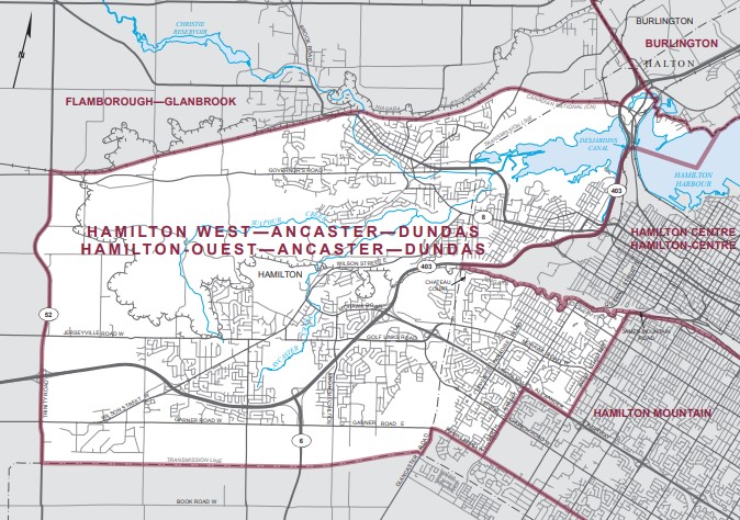 The constituency of Hamilton West-Ancaster-Dundas was created by the 2012 federal electoral boundaries redistribution. It includes part of the City of Hamilton and encompasses the communities of Ancaster and Dundas.