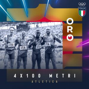TOKYO – 6 agosto 2021, un’altra giornata storica per lo sport italiano. Trionfa anche la 4×100 azzurra: con 37”50 gli azzurri conquistano l’oro davanti alla Gran Bretagna (37”51) ed al Canada (37”70). Patta, Jacobs, Desalu e Tortu (nella foto di Italia Team) conquistano una fantastica medaglia d’oro olimpica. Per l’Italia Team, dopo le altre vittorie di oggi, è la 38esima medaglia, record assoluto ai Giochi Olimpici, che migliora i 36 podi ottenuti dalle spedizioni azzurre di Los Angeles 1932 e Roma 1960.