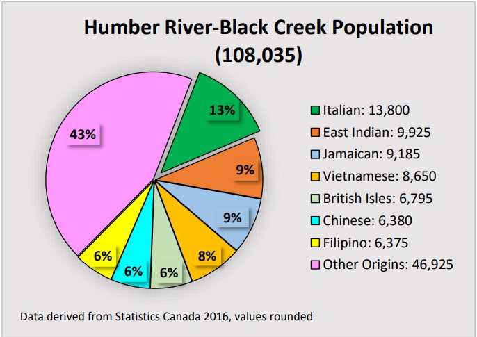 As of 2016, the riding had a population of 113,025. The area is a popular place to call home for many ethnic groups. Italians, at 12% of the district population, are one of the largest cultural groups which originate from Europe. →