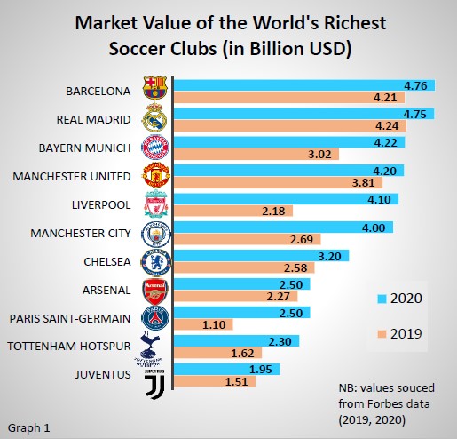 When considering the world’s wealthiest sports teams, soccer clubs draw in big money. In 2020, the combined value among the top 10 giants was about $36.5 Billion USD, according to the Forbes list of the world’s richest soccer clubs.