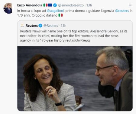 [GTranslate]LONDON – For the first time in its 170-year history, the British news agency Reuters will be led by a woman. Italian, to be precise. Alessandra Galloni (in the ‘tweet’ above), 47 years old, born in Rome: she will replace Stephen J. Adler who will retire in the next few days after leading the editorial office for the last ten years. →