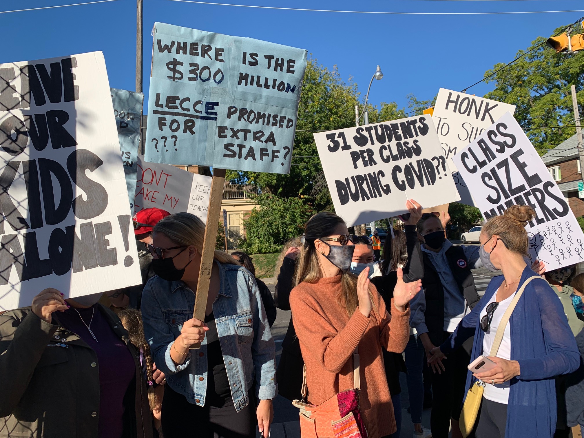 Parent groups and concerned community members rally in solidarity to protest the province’s plan to increase class sizes. Parents held coordinated demonstrations at several Catholic elementary schools across Toronto calling on the Ontario government and the Toronto Catholic District School Board (TCDSB) to halt the reorganization of class sizes.