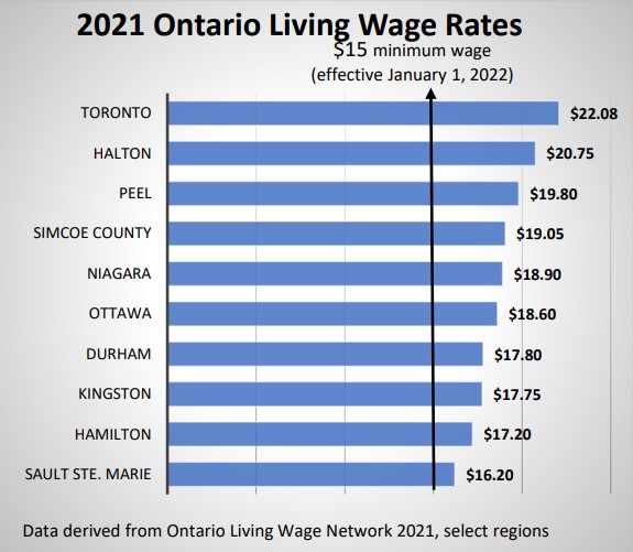 The province has announced that effective January 1, 2022, the minimum wage will increase to $15 per hour. Currently, the rate is $14.35 per hour. Depending on where you live in Ontario, those earning minimum wage – the amount employers must pay by law – may not make enough to afford “living” in the community they call home.