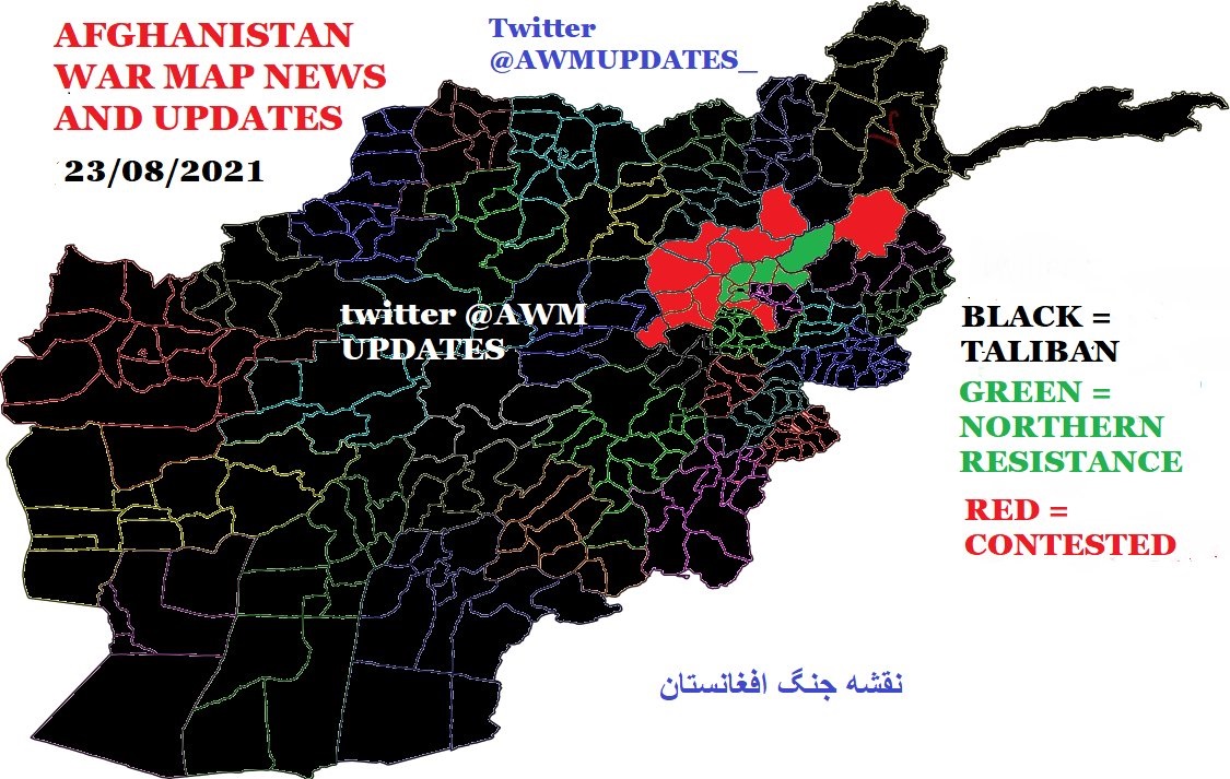 Suhail Shaheen also said that “they occupied our country. If we occupied yours, what would you say?”. But the question should be turned to those who, in these hours, are resisting the Taliban “from within”. Like the National Resistance Front of Afghanistan (NRF). Ali Nazary, head of foreign relations for the NRF (headed by Ahmad Massoud, son of the ‘Lion of Panjshir’ Ahmad Shah Massoud and considered the leader of the resistance to the Taliban), said that in the Panjshir Valley “the anti-Taliban resistance can count on thousands of people ready to fight”. But it is a resistance under siege. As can be seen in the map published today on Twitter by Awm – Afghanistan war map (in the pic above and updated every day at https://twitter.com/AWMUpdates), Afghanistan is almost completely in the hands of the Taliban, except for some areas “contested “and, in fact, the Panjshir still controlled by the Northern Alliance.
