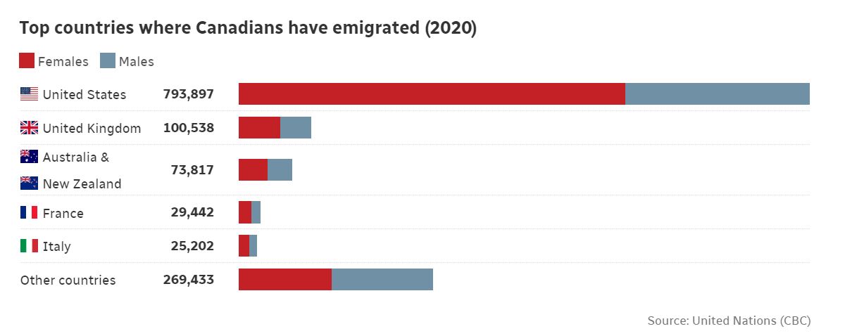 United Nations data compiled by Statistics Canada – and also published by CBC – shows that the United States is by far the most common destination for Canadian migrants. There were about 800,000 Canadians living in the United States in 2020 (see the graphic above, published by CBC), eight times more than the 100,000 living in the United Kingdom, according to the latest available United Nations data. Followed by Australia and New Zealand, France and Italy, with 25,202 Canadians (including, probably, also many Italian Canadians) who have chosen to go (or return?) to the “Bel Paese”.
