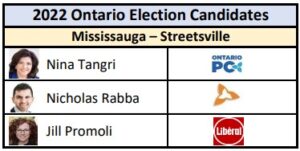 Nina Tangri, current MPP, seeks to retain the seat for the PC. In 2018, she defeated then incumbent Bob Delaney (who held the seat between 2007 and 2018) and took the riding from the Liberals with 43.5% support of the electorate (20,879 votes). That year, the NDP took 25.8% of the vote, but the PC’s margin of victory was 8,486 votes. The Liberals followed with 25.7% of the vote.