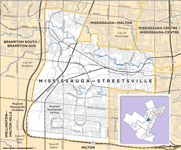 Created in 2003, Mississauga–Streetsville is situated in the Regional Municipality of Peel. It encompasses the north-west portion of the City of Mississauga and includes the communities of Meadowvale and Streetsville. Mississauga–Streetsville is one of five electoral districts in Mississauga where a tough competition could develop between the PC and the Liberals.