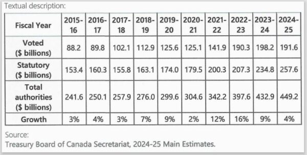 Some of the monies being requested by Parliament are already committed to “Statutory obligations” known as transfers to provinces, individuals or other entities entitled to receive these transfers by law. As per the chart, 63% of the $449.2 billion fall into that category.