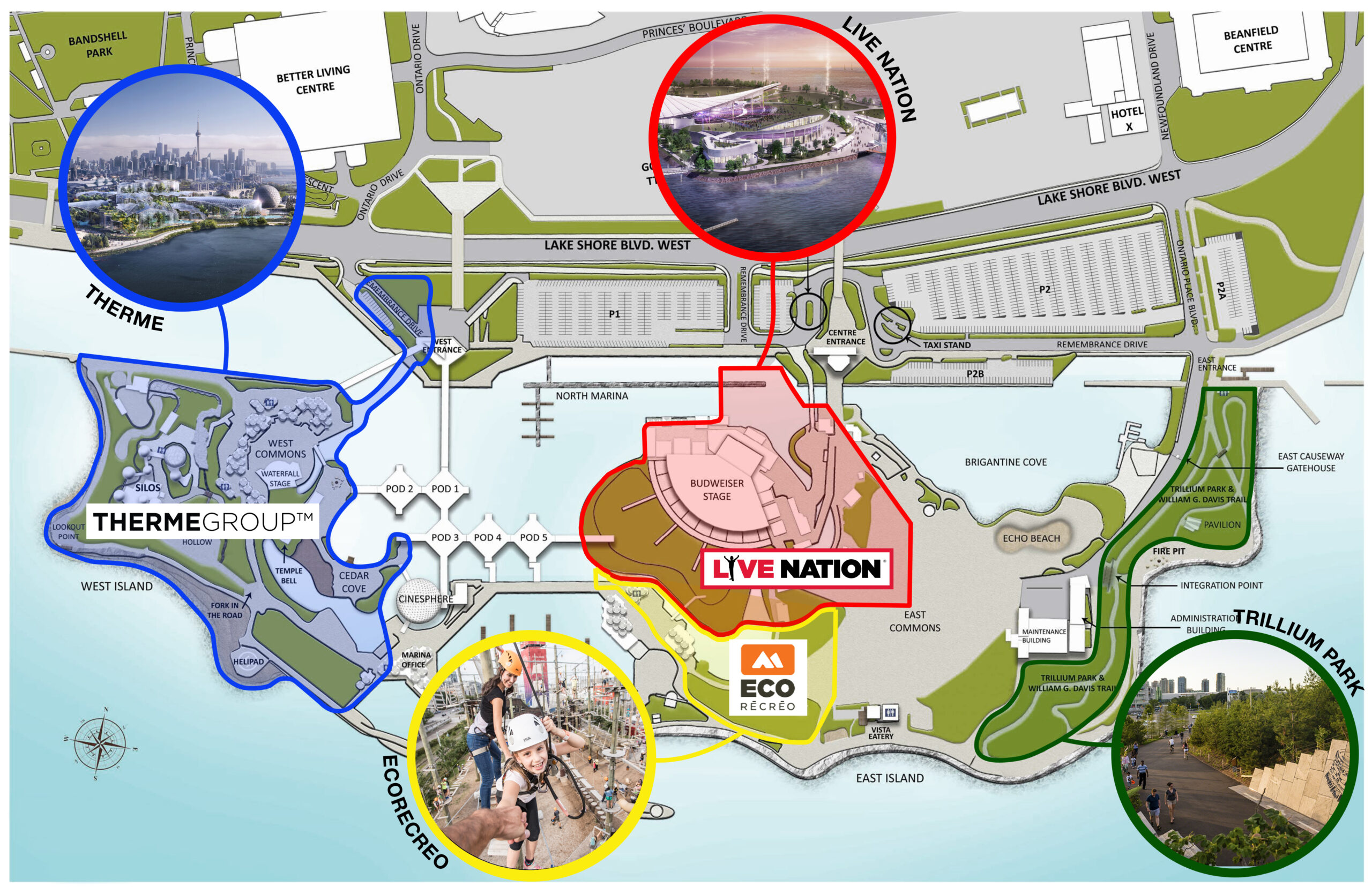 According to plans released by the Ontario government, Therme Group will build Therme Canada on the western part of the island. It will operate as an all-season resort offering amenities for the whole family. The concept attraction includes “pools, waterslides, botanical spaces to relax, as well as sports performance and recovery services”. (see site map below, credit: Ontario.ca)