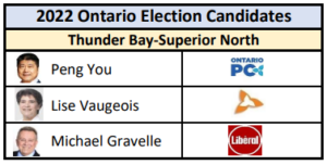 This is the second time Vaugeois faces off with Gravelle in a general election. Meanwhile, Peng You aims to gain more support for the PC party.