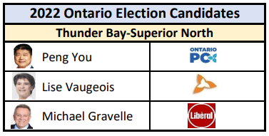 A traditional Liberal riding, Michael Gravelle, current MPP, is seeking re-election. He has represented the riding since 1999. In 2018, Gravelle won 39.9% of the vote with 11,973 votes. NDP candidate Lise Vaugeois was close behind with 37.1% while the Progressive Conservatives (PC) secured just 17.9%. The margin of victory was only 813 votes.